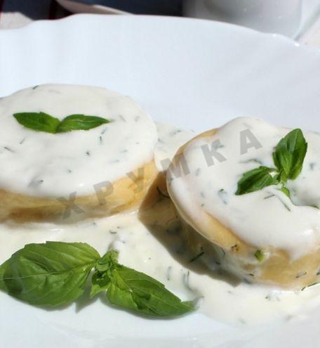Для начинки все ингредиенты смешать и слепить 3 плоские лепешечки по размеру чуть меньше окружности формы. Вливаем в формочки по 1 ст. л. теста,выкладываем начинку.
