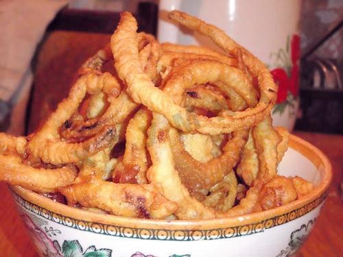 3. Макаем лук в кляр и аккуратно кладём его на сковородку и обжариваем с двух сторон. Обжариваем до золотистой корочки.