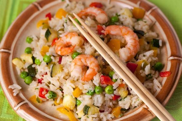 Рис к тому моменту должен будет уже простоять 10 минут после выключения. Вываливайте его на сковородку к овощам, досыпайте горошек и креветок