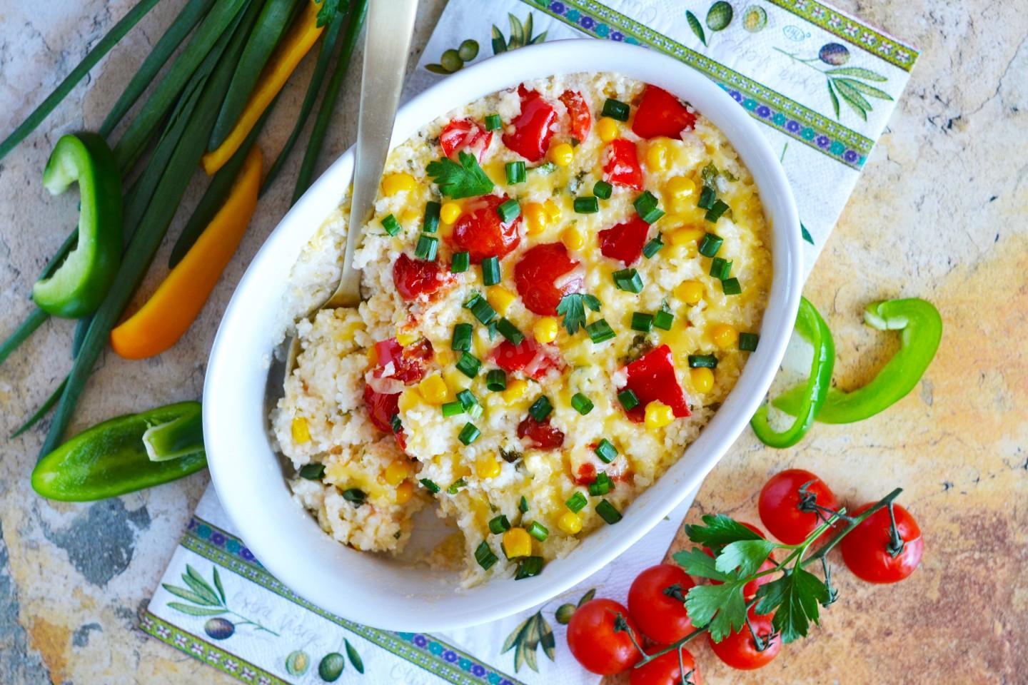 В миске соедините рис и обжаренные овощи. Добавьте консервированную кукурузу, тертый сыр, сметану и зелень.