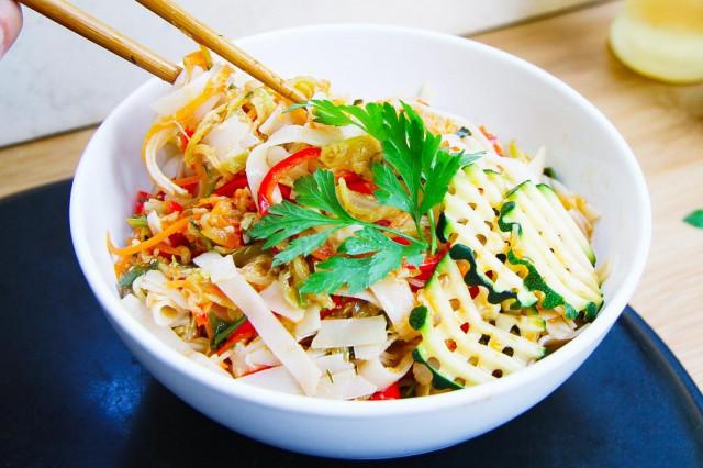 Как сделать рисовую лапшу с овощами? Подготовьте продукты. Рисовую лапшу нужно предварительно довести до полуготовности. Ориентируйтесь на инструкцию, указанную на упаковке вашей лапши. Мне достаточно было залить лапшу крутым кипятком и отставить настаиваться на 20-25 минут.