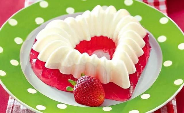 Вынуть форму с желе из холодильника за 10 минут до подачи. Аккуратно перевернуть на блюдо. Нарезать оставшиеся ягоды клубники и украсить ими желе.