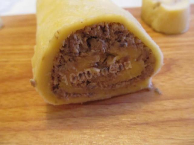 Рукав разрезать и выложить на пласт сыра начинку. Плотно свернуть в рулет. Сырный рулет положить в целлофановый пакет и поставить в холодильник. Когда хорошо остынет, нарезать ломтиками.