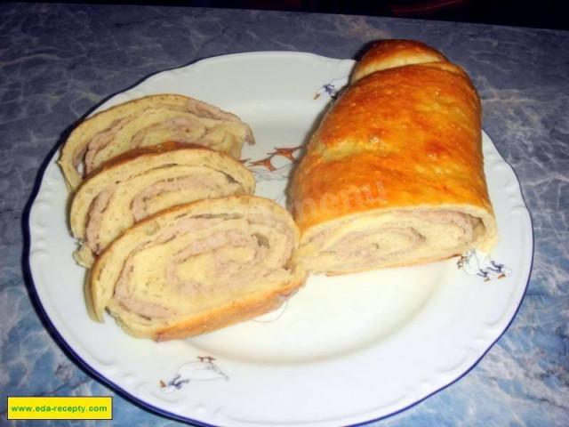 Раскатать тесто в пласт, смазать фаршем и свернуть в рулет.