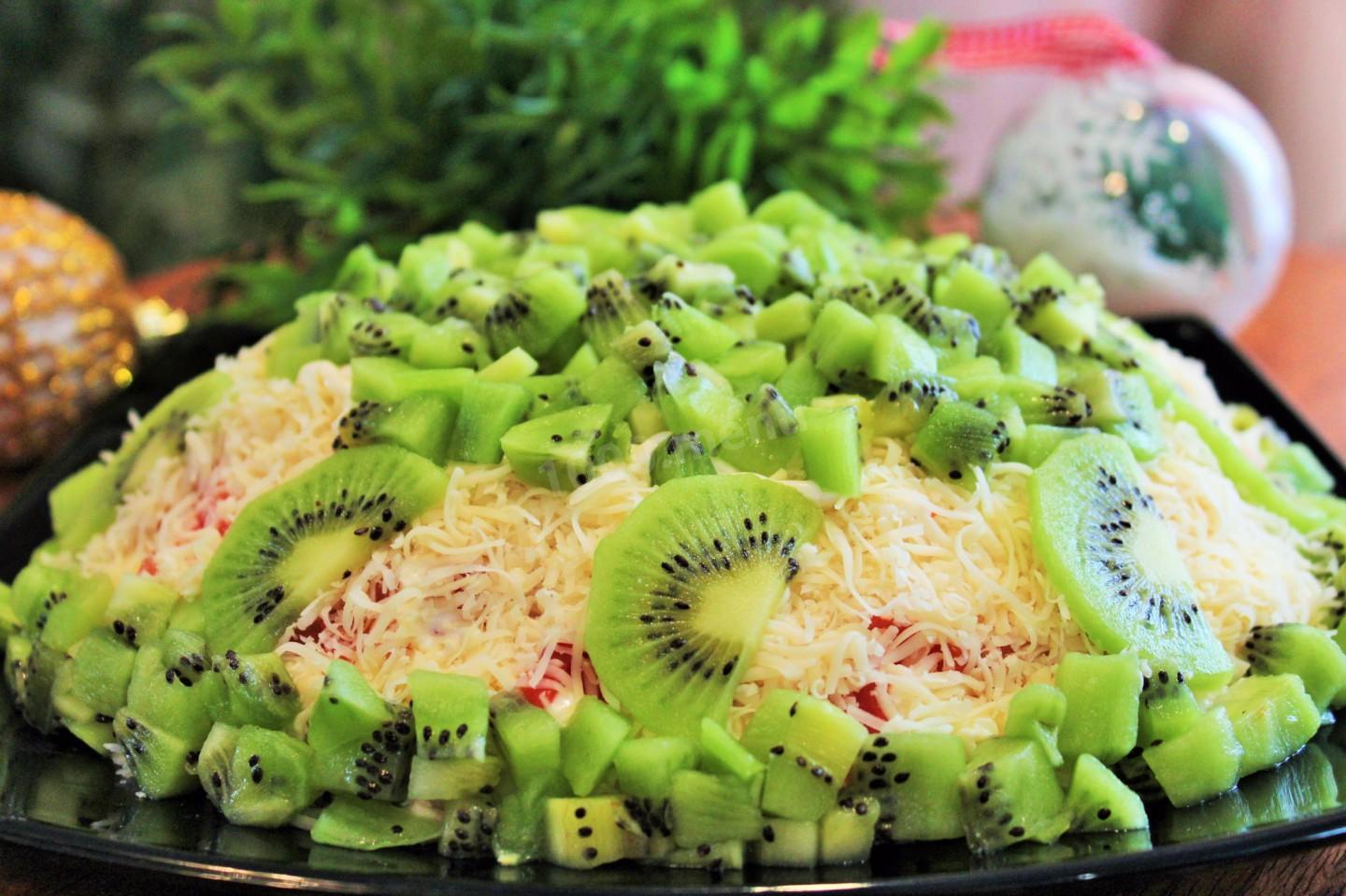 Куриное филе предварительно отварить. Мелко нарежем все ингредиенты. Один киви оставим для украшения.