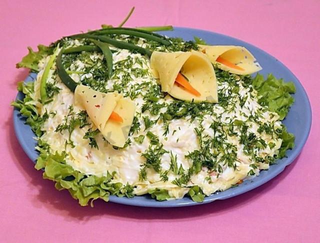 И последний слой - нарезанные яйца, можно немного присолить. Аккуратно по всей поверхности салата наносим слой майонеза.