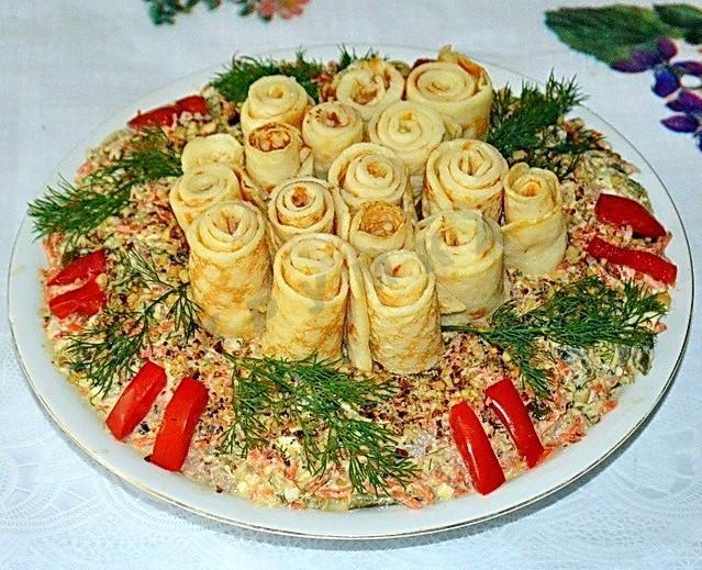 Украшаем сверху салат рулетиками из блинчиков. Мне салат в таком виде показался бледным, поэтому я добавила укроп и полосочки, вырезанные из помидорки. Если Вы хотите покрыть рулетиками из блинчиков всю поверхность салата, - сделайте 2 порции теста для блинчков. Всё, Кояш готов! Особенно он хорош немного охлажденным. Угощайтесь, приятного аппетита!