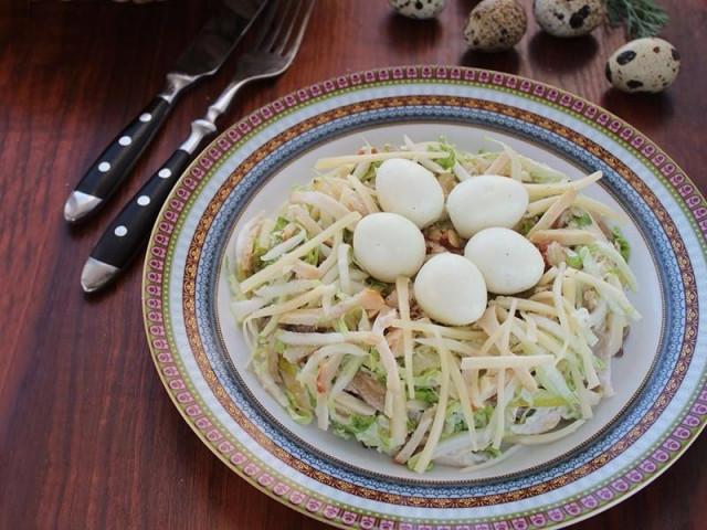 5. Выкладываем на блюдо салат в виде гнезда. Оставленными капустой, куриным филе и сыром украшаем края салата.
