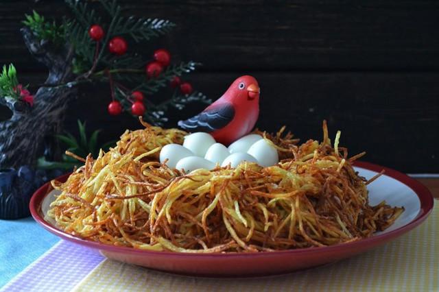 6. Выкладываем салат на блюдо. Делаем углубление в виде гнезда. Красиво выкладываем картофель.