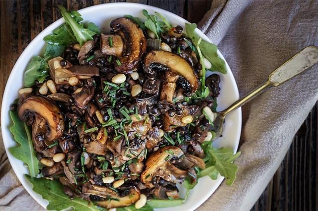 5. Выложить на блюдо подушку из рукколы, уложить на неё смесь грибов, чечевицы и лука.