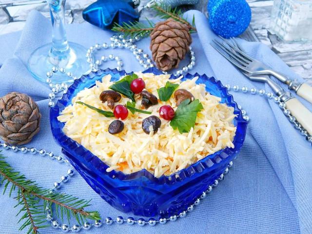 Последним слоем присыпьте салат натертым твердым сыром. Кто любит более соленые блюда, может подсолить слои салата, но майонез содержит вполне достаточно соли. Украсьте салат по своему усмотрению, можно грибочками, зеленью и ягодами клюквы.