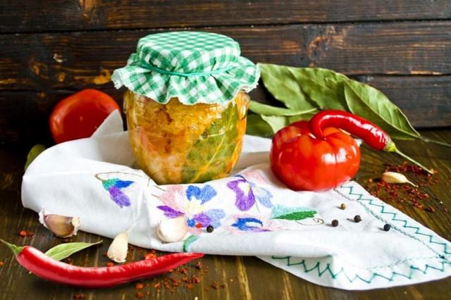6. Раскладываем заготовку по сухим стерильным банкам, утрамбовываем ложкой, а сверху в каждую банку наливаем горячее растительное масло (слой должен быть не менее 0,5 см).