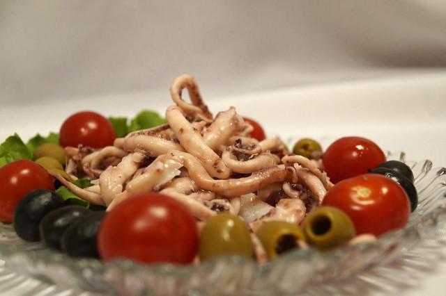 5. При подаче достаньте кусочки кальмара из масла и приправьте лимонным соком. Также они прекрасно подойдут для приготовления салатов.