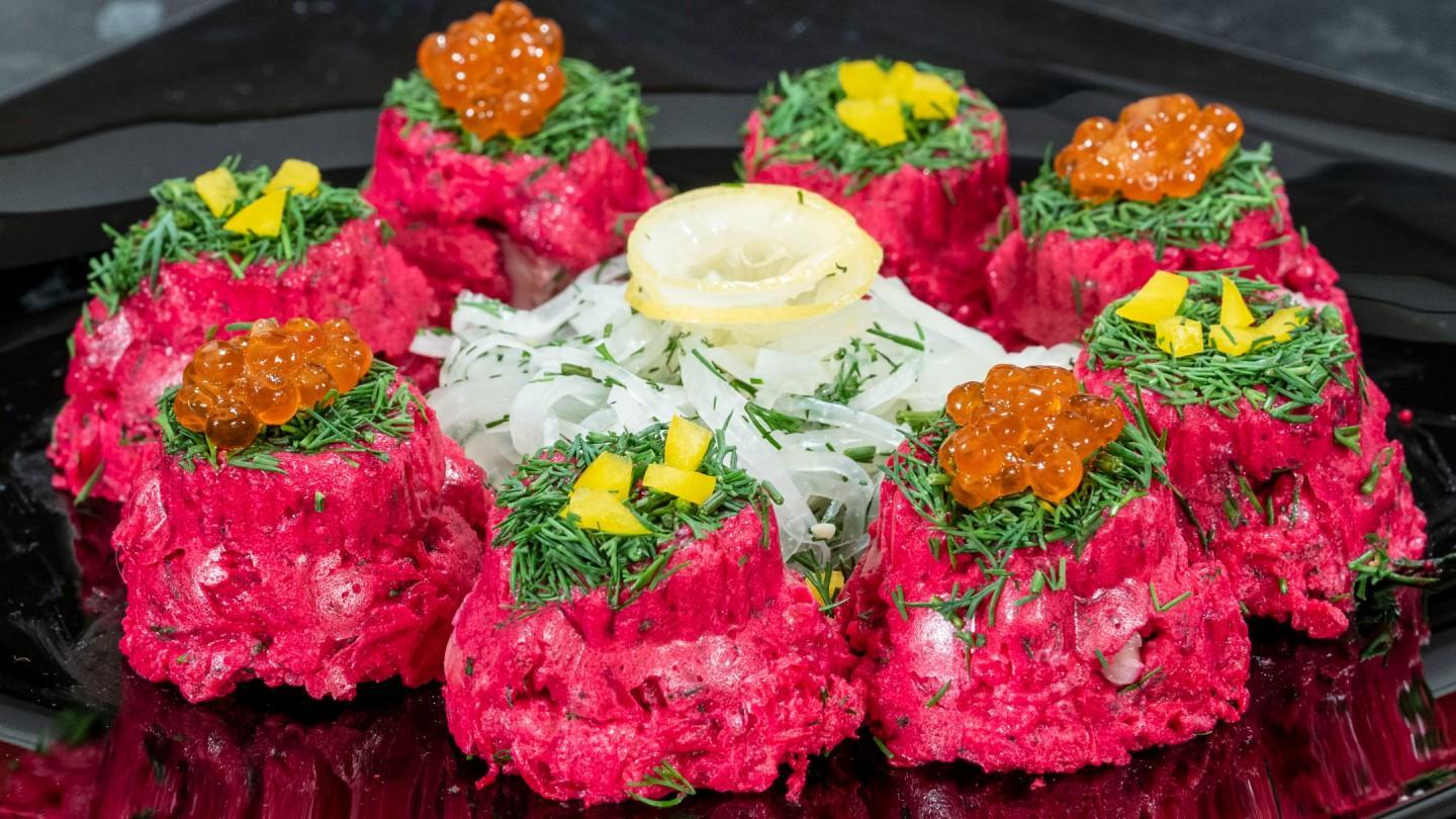 По прошествии времени выкладываем на тарелки маринованный лук с нарезанными дольками лимона, затем порционный салат из формочек, который украшаем сверху по вкусу нарезанным мелким кубиком болгарским перцем, зеленью укропа и красной икрой.