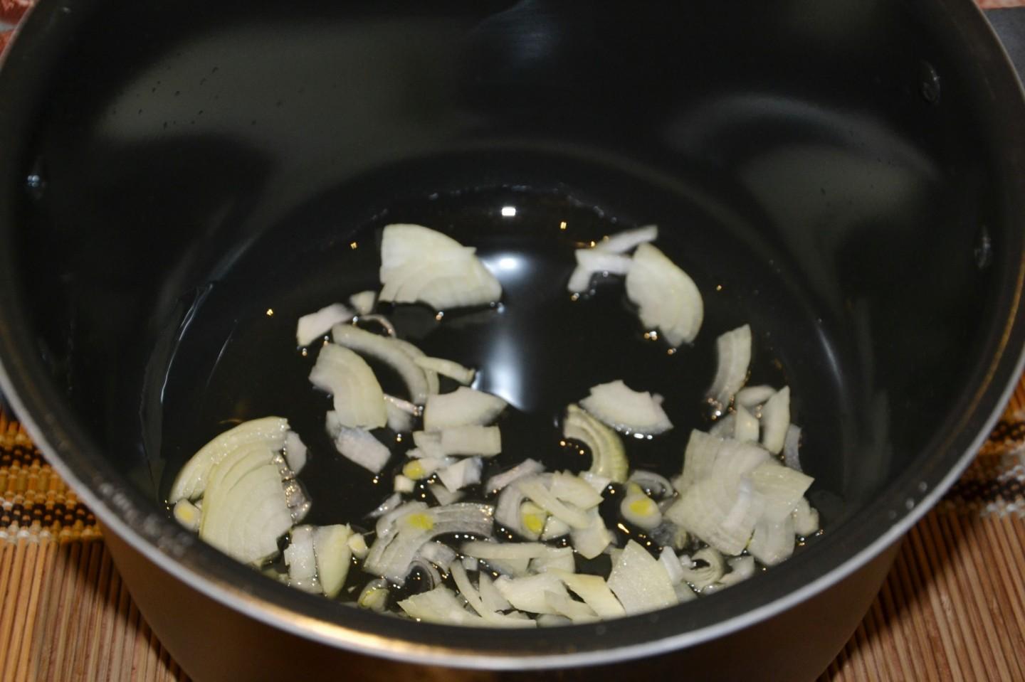 Кладем лук в мультиварку и обжариваем его до легкой золотистости.