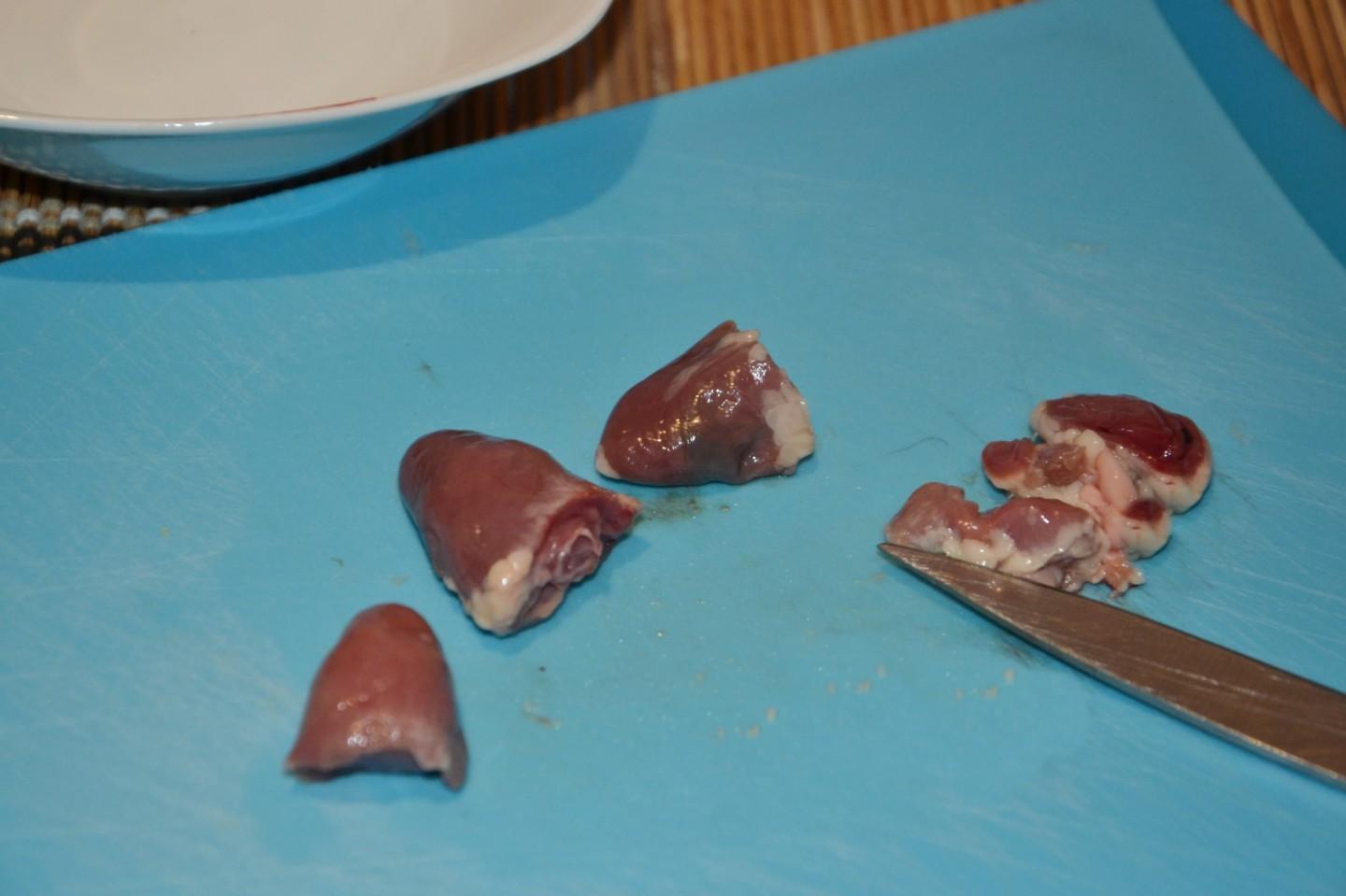 Теперь займемся сердечками. Их нужно почистить. Кто-то оставляет их в таком виде как есть, я же все таки предпочитаю отрезать верхнюю часть (там попадаются сгустки крови).