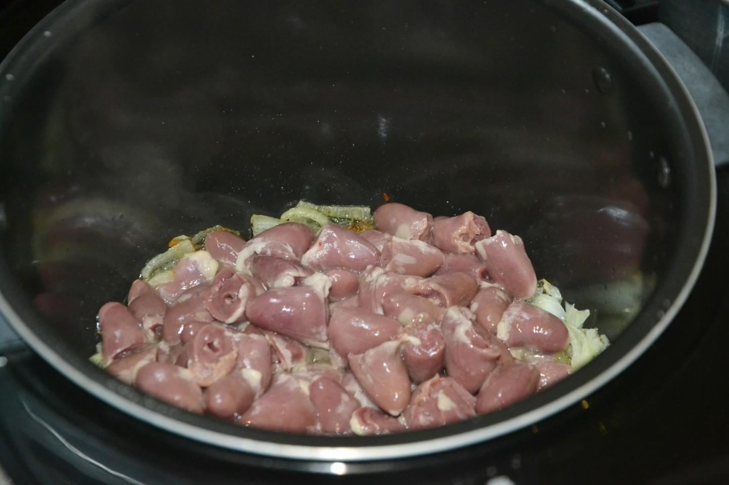 Сердечки выкладываем к луку и на том же режиме оставлям с открытой крышкой на 15 минут, пусть выпарится жидкость.