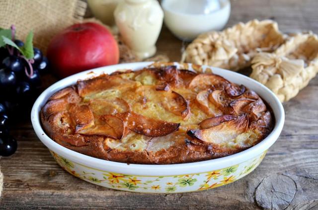 Подготовьте жаропрочную форму, в которой будете печь пирог. Если у вас форма, к которой выпечка имеет тенденцию прилипать, смажьте ее небольшим количеством растительного масла. Мне нравится выпекать такую шарлотку в невысокой широкой форме - так она лучше пропекается внутри. Выложите тесто с яблоками. Выпекайте пирог в разогретой до 200 градусов духовке около 30 минут, но ориентируйтесь по своей духовке. Серединка у пирога должна стать достаточно плотной