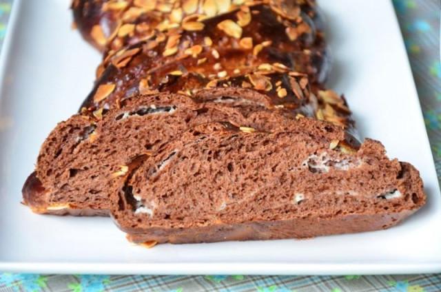 Подошедшую плетенку смазываем яйцом, посыпаем миндальными лепестками и выпекаем в разогретой до 180 С духовке около 30-40 минут.