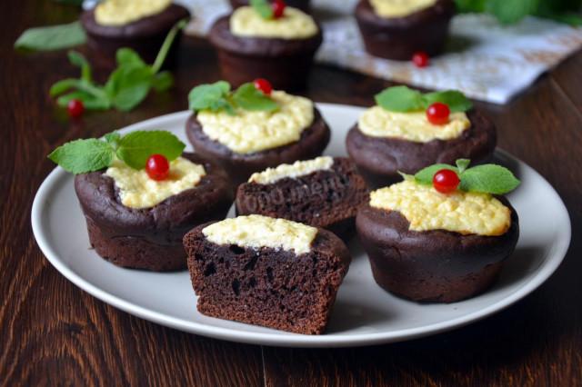 Мягкие шоколадные кексы с творожной начинкой. Отличные получились кексы - пористые, воздушные и шоколадные-прешоколадные. Можно в тесто добавить кусочки шоколада (термостойкого или обычного).
