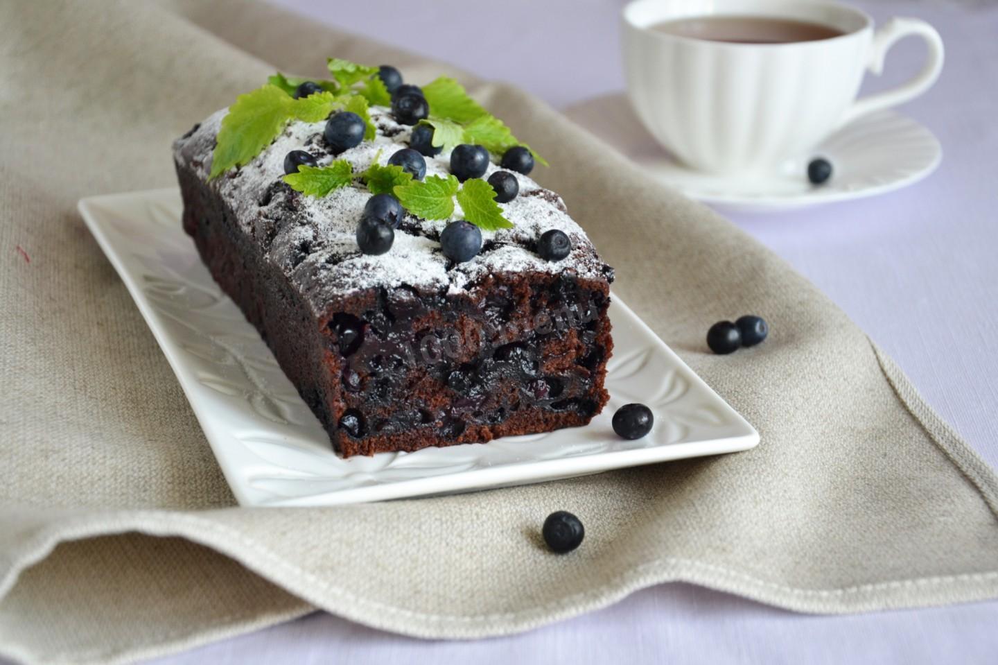 Ароматный шоколадный кекс с большим количеством черники. Если кекс будут кушать дети, то коньяк в тесто можно не добавлять совсем. Или заменить его на аналогичный ароматизатор.