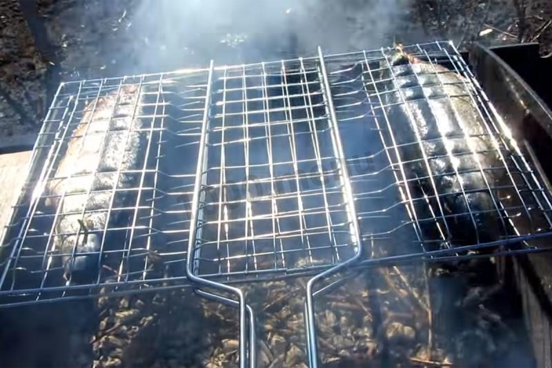 Угли к этому моменту должны прогореть. На горячие угли положите молодые веточки фруктовых деревьев (тут - вишня) для аромата копченого. Рыбу оботрите от маринада (внутри можно оставить лук), натрите растительным маслом и положите на решетку.