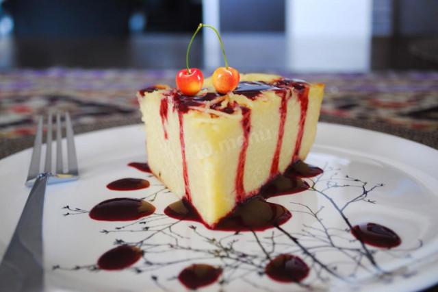 10. Нарезаем запеканку на порционные кусочки, поливаем малиновым соусом и подаем на стол.