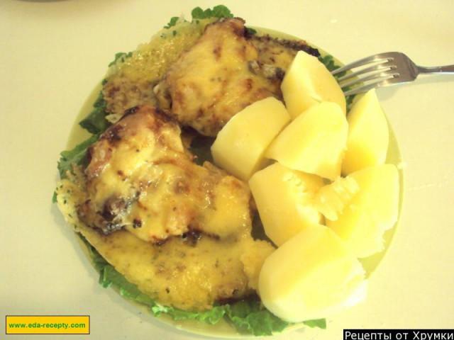 Если вы готовите романтический ужин, то можно выложить на тарелку листья салата и на них бедрышки. Гарнир может быть любым, какой Вам больше нравится. Я решила отварить картофель.