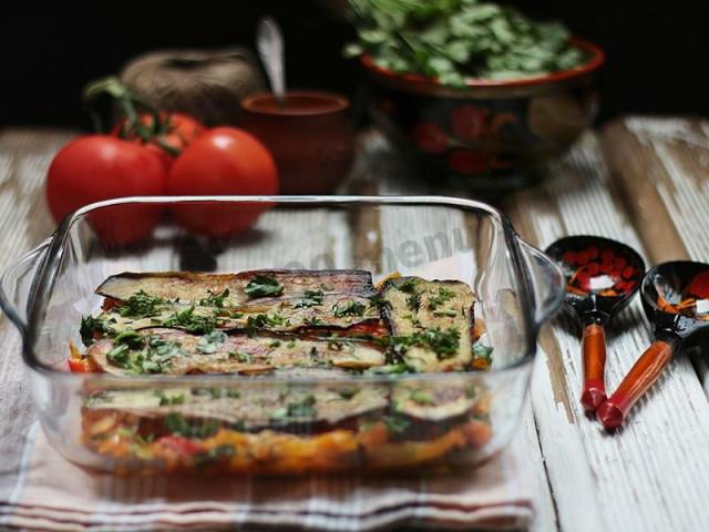 11. В красивую емкость выложите слоями пластинки баклажанов и тушеные овощи. Блюдо можно подогреть или же подавать в холодном виде.