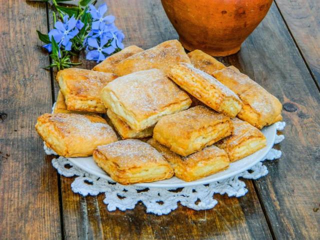 На вкус слойки напоминают что-то среднее между творожным печеньем и пирожным наполеон. Они не очень сладкие сами по себе, поэтому смело посыпайте сахарной пудрой.