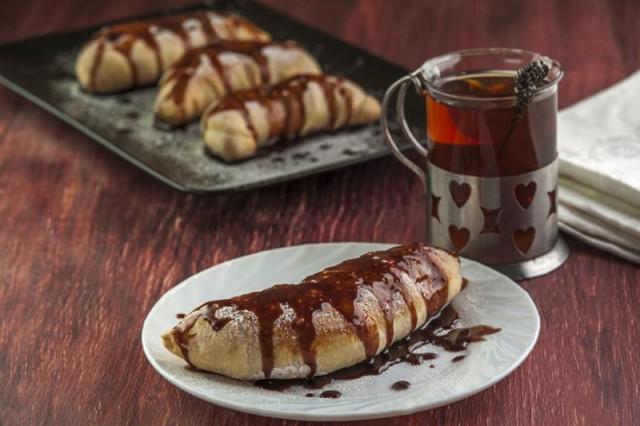 8. Перед подачей на стол готовые слойки посыпьте сахарной пудрой и полейте растопленным шоколадом.