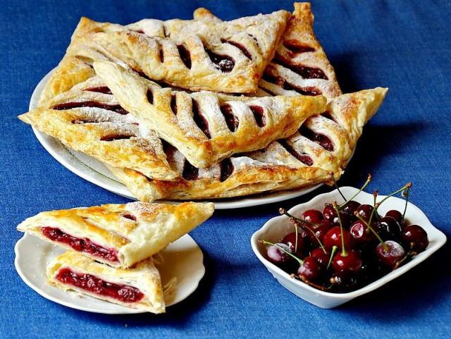Слоечки с пылу, с жару с кисло-сладкой вишенкой к чаю, как это вкусно! Хрустящие, румяные слойки с сочной, не приторной начинкой - это очень вкусно! У меня в морозильной камере иногда хранится упаковка слоёного теста на всякий случай. Вдруг захочется какой-нибудь быстрой выпечки, без заморочек. Основное время уходит на размораживание теста. Расхваливать вкус слоек с вишневым вареньем не имеет смысла, потому что это - вкус, знакомый с детства! Просто готовьте и наслаждайтесь!