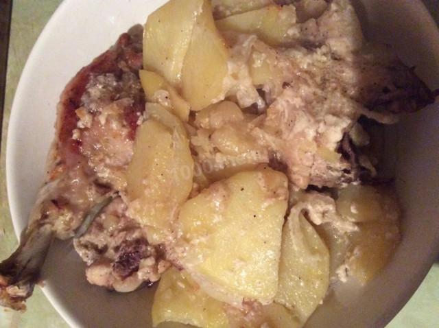 Все тщательно размешать руками, разделив все картошечки и промазав каждый кусочек курицы со всех сторон. Выложить на противень и закрыть плотно фольгой.
