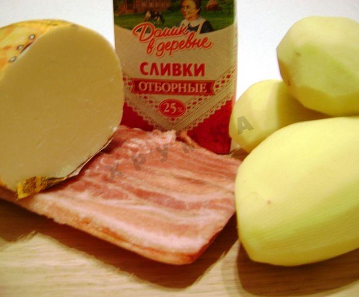 Очистить картофель и чеснок. Промыть и обсушить. Половинкой зубчика натереть форму для запекания. Смазать ее сливочным маслом. Измельчить чеснок, картофель нарезать тонкими ломтиками, грудинку нарезать не толстыми лепестками, сыр натереть на крупной терке.