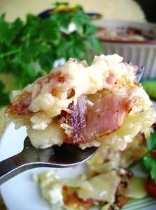 В миске смешать картофель с чесноком и грудинкой, посолить и поперчить, посыпать молотым мускатным орехом и половиной сыра. Перемешать хорошенько и выложить в форму.