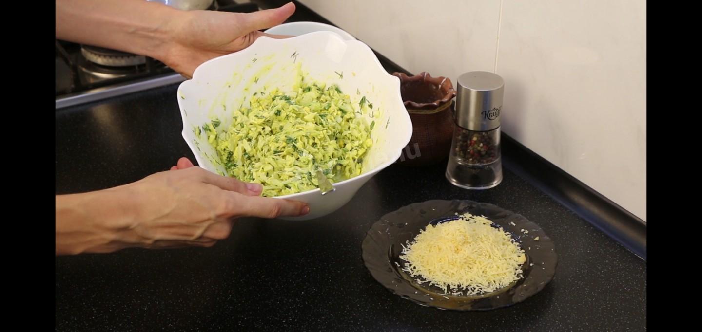 Капусту заранее мелко нашинковала( у меня молодая) яйца мелко нарезала кубиками, зелень измельчила, сыр натерла. Капусту заливаю кипятком и оставляю минут на 5-10. Молодой будет достаточно 5 минут, для старой 10. Затем хорошо отжимаю и смешиваю с яйцами, зеленью, сметаной, и солю и перчу по вкусу. Будьте внимательны, сыр я не добавляла!!! Он идет на посыпку!!!