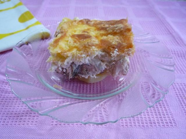 Картофель нарезать кружками, уложить на противень. Филе сома нарезать ломтиками и уложить на картофель, посолить и поперчить.