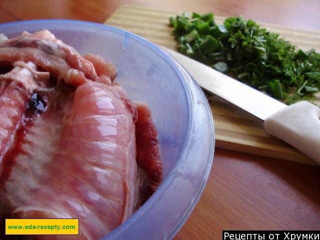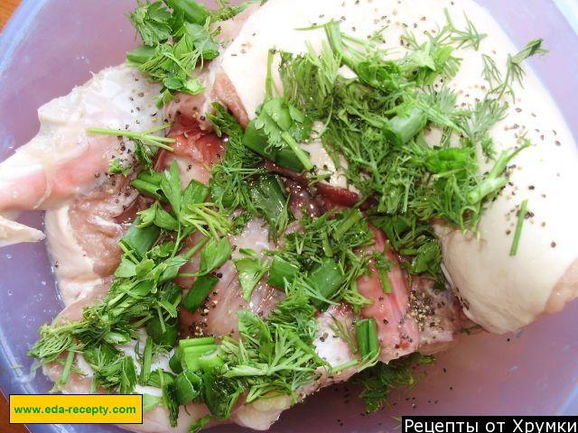 Затем засыпаем сома рубленной зеленью и забываем о нем минут на 20, чтобы он за это время как следует пропитался специями. В это время займемся рисом - нашим гарниром. Можно его готовить в горшках, чуть позже, прямо вместе с рыбой. Это очень удобно. Нужно только засыпать в горшочек рис, отмерить воды и посолить. Можно попробовать басмати. Очень его советую.