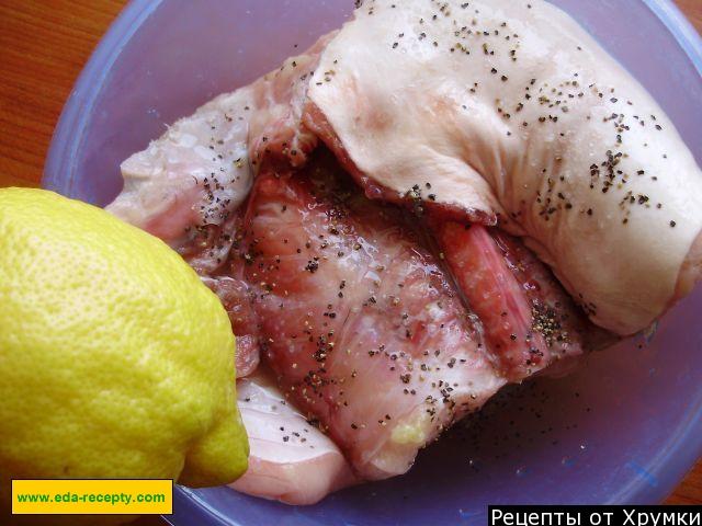 Укладываем рыбу в чашу, поливаем соком лимона, солим, перчим.