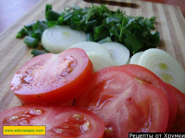 Нарезаем предварительно помытые помидоры и очищенный лук кольцами.