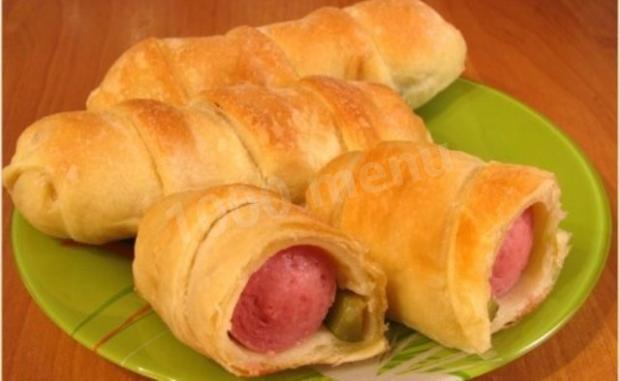 Я очень люблю сосиски в слоёном тесте. Частенько готовлю эту еду на ужин для своего мужа и сама иногда позволяю себе поесть их на ночь - очень уж они вкусные. Если вы хотите порадовать своих близких вкусной выпечкой, следуйте несложным инструкциям кулинарного рецепта. Начинаем мы приготовление этого блюда с того, что подготавливаем все ингредиенты. Для этого маринованные огурчики разрезаем вдоль на 4-8 частей (всё зависит от величины огурцов). Затем нарезаем твёрдый или полутвёрдый сыр на тонкие пластинки. После этого берём тесто и раскатываем его в пласт толщиною примерно в 3 миллиметра. Далее нарезаем тесто на полоски шириною в 3-4 сантиметра и заворачиваем каждую размороженную сосиску в такую полосочку теста вместе с морковью, сыром или огурчиком (на ваш выбор). Теперь укладываем наши изделия на смазанный маслом противень и ставим запекаться в разогретую до 180 градусов духовку примерно на 25-30 минут. По прошествии этого времени готовые сосиски в слоёном тесте выкладываем на блюдо и подаём к столу.