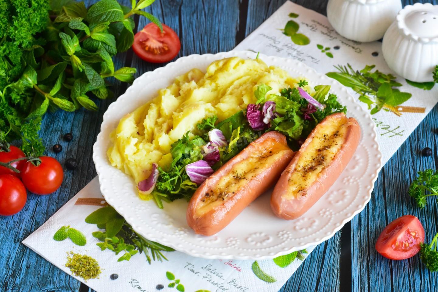 Подавайте сосиски сразу же пока они горячие и сыр тянется. Подойдет любой гарнир. Я подавала с картофельным пюре и свежей зеленью. Приятного аппетита!
