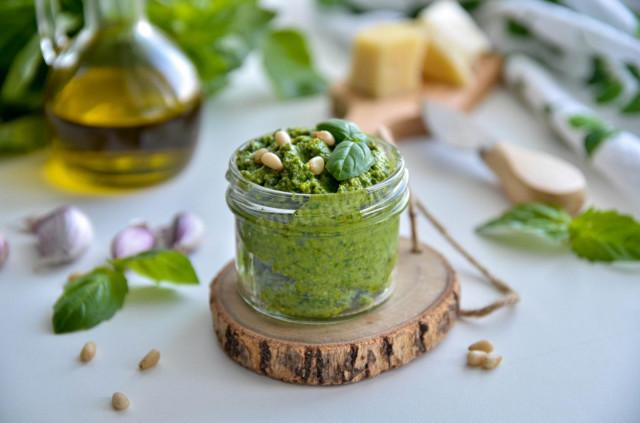 Вместо базилика можно брать любую зелень - петрушку, рукколу, шпинат, кинзу. Орехи также подойдут любые - кешью, грецкие, миндаль. Но классический соус все-таки с базиликом и кедровыми орехами.