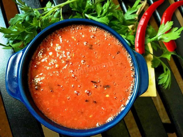 Готовь отличный соус! Без термообработки! Соус с маринованным имбирем имеет очень интересную вкусовую гамму. Он содержит в себе много полезных витаминов и микроэлементов, так как не подвергается варке. Для приготовления можно взять помидоры абсолютно любого сорта, лишь бы они были спелыми. Подойдут красные и розовые, а желтые придадут не такой насыщенный цвет. Перец следует выбрать плотный, с достаточным количеством мякоти. Соус имеет сладковато-терпкий вкус, отлично подойдет к мясным блюдам и птице. Солить блюдо не нужно.