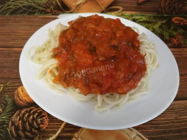 Блюдо получается очень вкусным и сытным. Если вы не отказываетесь по каким-то причинам от продуктов животного происхождения, то можно предварительно приготовить мясо (свинина, говядина, баранина, курица и пр.), а далее сделать соус по данному рецепту.
