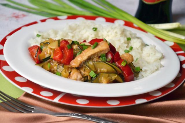 1. Куриное филе нарезать тонкими полосками. Болгарский перец нарезать соломкой, цукини — полукружьями, чеснок и имбирь очистить и мелко порубить.