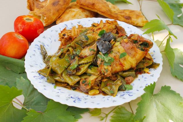 Накройте казан крышкой и оставьте на слабом костре до полной готовности фасоли. Время приготовления зависит от того, насколько молодая фасоль у вас ( мне потребовалось около 30 минут). Периодически открывайте крышку, если фасоль начинает пригорать, то добавьте совсем немного кипятка. Если помидоры сочные, то их вполне хватает для приготовления без добавления воды.