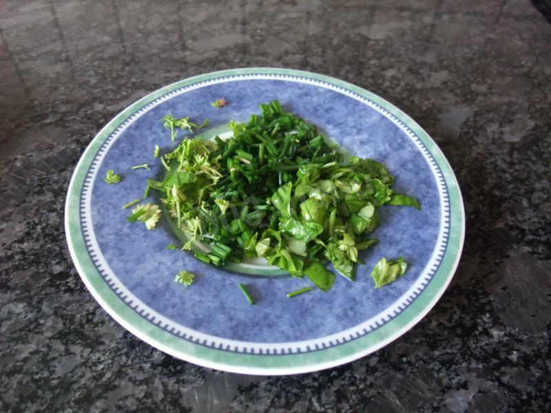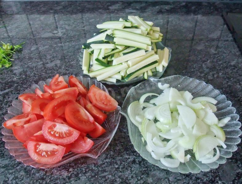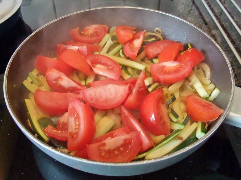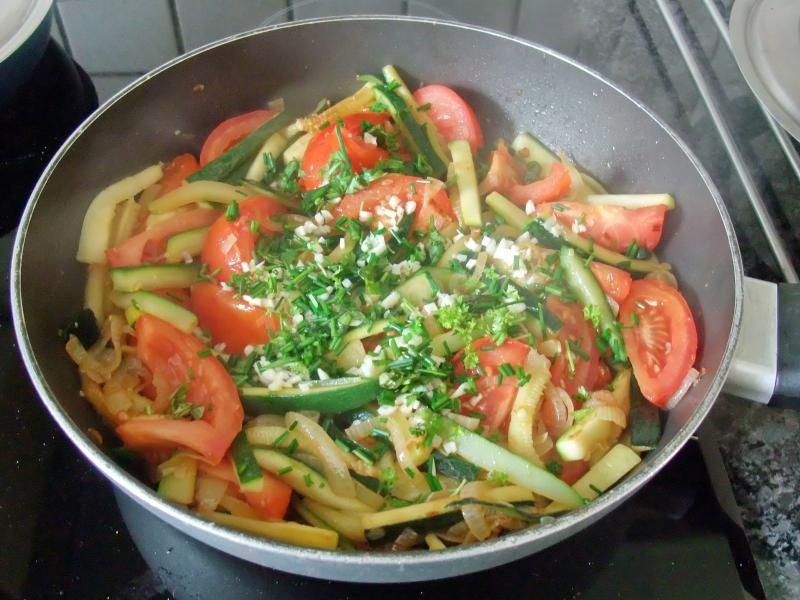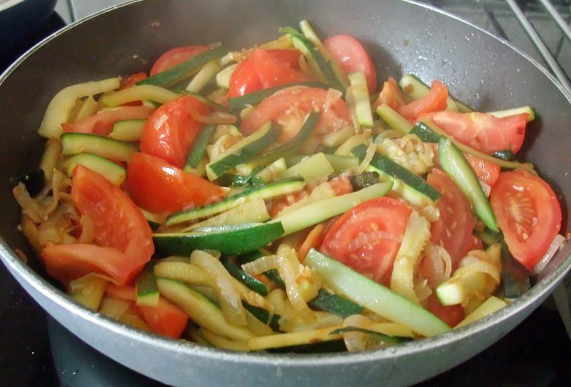 В другой сковороде обжарить лук, кабачок, помидор. В конце положить рубленую зелень и чеснок.