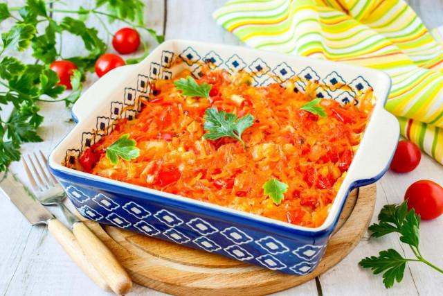 Подготовленную овощную поджарку выложите в форму ровным слоем по поверхности рыбы. Поставьте форму в духовку, предварительно разогретую до 180 градусов, на 30 минут. При запекании ориентируйтесь по своей духовке.