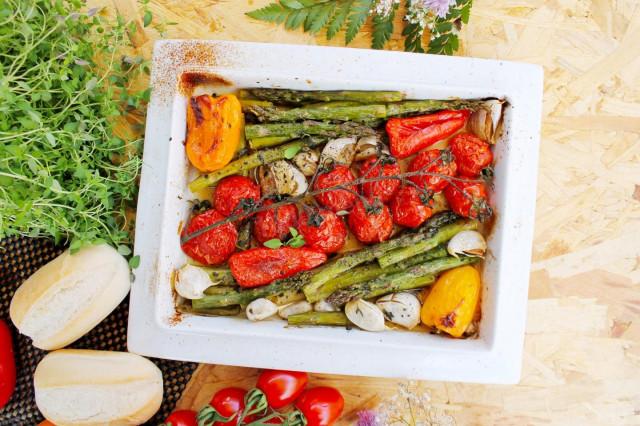 Форму аккуратно выньте из духовки (осторожно, не обожгитесь!). Доложите к пропечённому чесноку помидоры черри, болгарские перцы и спаржу. Я разрезала каждый стебелёк спаржи на пополам, так как целые веточки не поместились в форму. Полейте сверху ещё раз небольшим количеством оливкового масла, посолите по вкусу и поперчите.